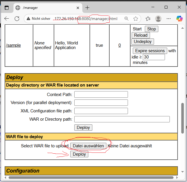 .war-Datei kann im Manager-UI von Tomcat deployed werden- vorherige Versionen vorher explizit undeployen